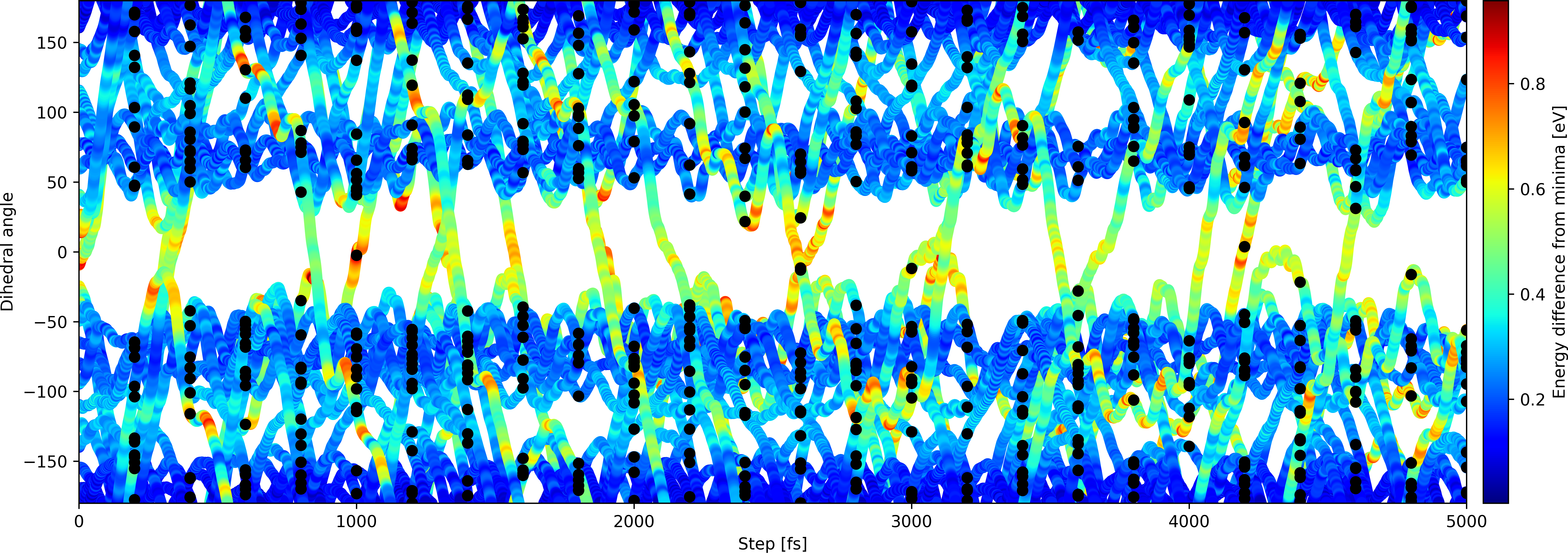 To test the method, we studied 1,2-dithioethane, a molecule whose dipole moment and polarizability vary with torsional motion. We trained a kernel ridge regression model using the relative-to-equilibrium descriptor, based on DFT/B3LYP/aug-cc-pVTZ calculations, and sampled the configurational space by running ground-state molecular dynamics. The selected points for the test set are shown in black: